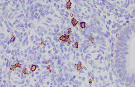 慢性子宮内膜炎の子宮内膜においてCD138という細胞マーカーが陽性の細胞(形質細胞)が認められます。子宮内膜組織を採取し、特殊な病理検査を行うことにより、慢性子宮内膜炎の診断を行います。