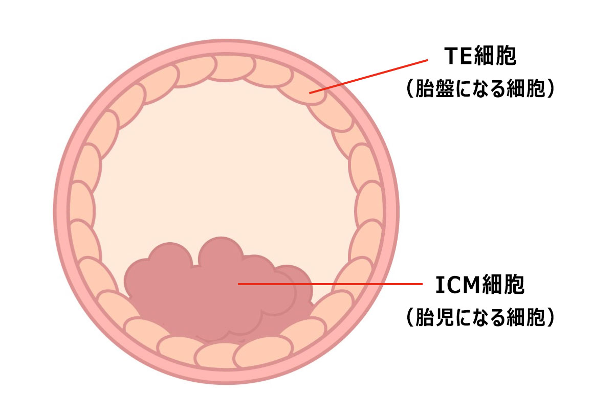 胚盤胞には細胞が100~200個あり、ICM細胞(胎児になる細胞)とTE細胞(胎盤になる細胞)に分かれています。
